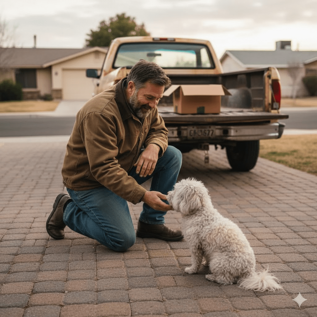Just as despair threatened to overwhelm her, a faint flicker of movement caught her eye from across the street. A tall, slightly disheveled figure emerged from a beat-up pickup truck, carrying a box. He didn’t look like the other people she’d encountered – no hurried glance away, no sharp shooing motions. Instead, his eyes, tired but kind, met hers. He paused, his expression softening, and Luna, against her better judgment, felt a tiny spark of hope ignite within her. She remained still, a nervous tremor running through her, unsure if this was another false dawn or a genuine moment of connection. The man, a local animal rescuer named Mark, had seen countless strays, but there was something about this small, white dog that tugged at his heart more than usual.