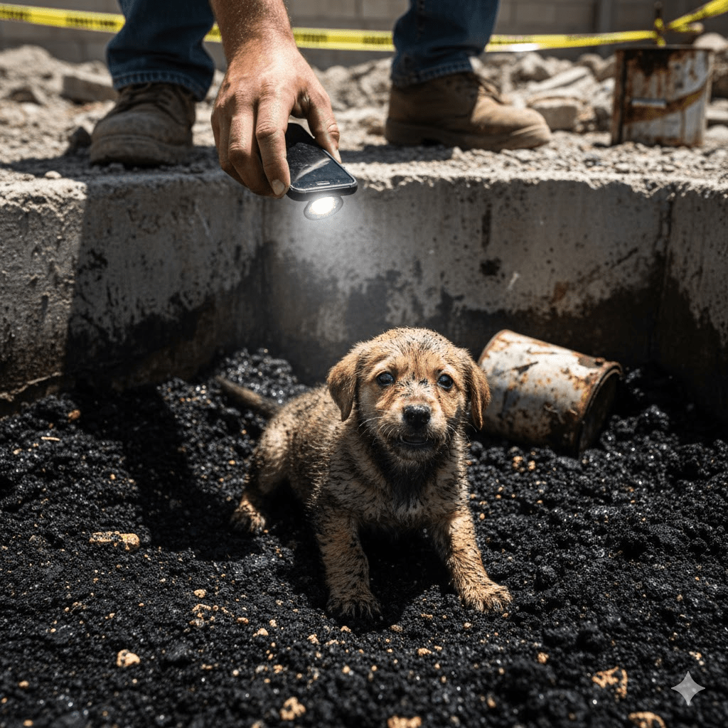 Peering into a discarded construction pit, a passerby, who wishes to remain anonymous, was confronted with a sight that would haunt their memory: a tiny, defenseless puppy, barely a few weeks old, struggling against a suffocating embrace of thick, black bitumen. The little creature, later named Trio, was almost entirely submerged, its small body caked in the viscous tar, its eyes wide with terror and exhaustion. This wasn’t just a stray animal in distress; this was a race against time, a desperate plea for survival in the most dire of circumstances. The air hung heavy with the smell of asphalt, and the puppy’s laboured breaths were the only sounds, a fragile testament to a life hanging by a thread. The gravity of the situation was immediate and overwhelming, prompting an urgent call for help that would set in motion a chain of events far more intricate and perilous than anyone could have imagined.