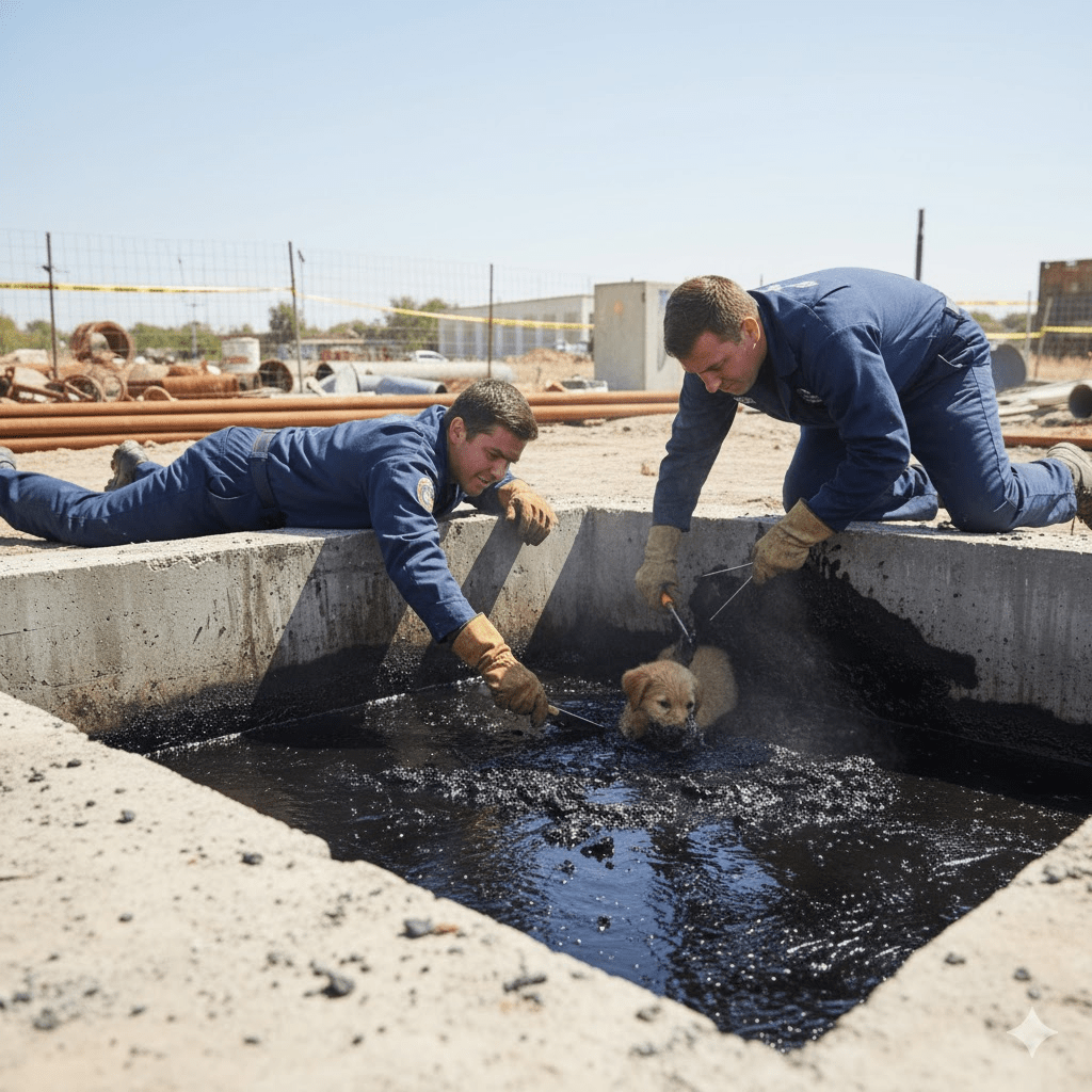 The initial rescue attempt was fraught with peril. The bitumen, heated by the scorching sun, was not only sticky but also dangerously hot, threatening to burn the tender skin of anyone who dared to touch it. Local animal control was immediately dispatched, but even their experienced team quickly realized this was no ordinary rescue. The puppy was so deeply embedded that conventional methods of extraction were impossible without causing further injury. Each movement Trio made, however slight, seemed to pull him deeper into the tarry prison. The team tried to carefully chip away at the hardened edges of the bitumen surrounding him, but the material was too dense and brittle in some places, and too fluid in others. The situation demanded a more specialized approach, and quickly. Time was running out, as the sun continued to bake the asphalt, raising Trio’s body temperature to dangerously high levels.