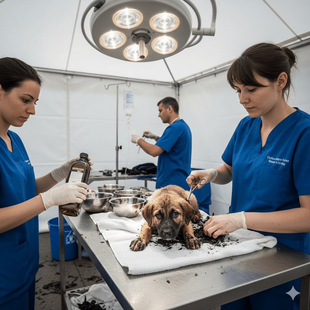 The real challenge began under the medical tent. Veterinarians and technicians, gloved and gowned, faced the daunting task of cleaning the bitumen from Trio’s fur without harming his delicate skin. They tried various solvents, from specialized pet-safe degreasers to olive oil, a commonly used home remedy for tar removal. However, the bitumen was unusually stubborn, clinging fiercely to his fur. Adding to the complication, Trio started to show signs of internal distress – his breathing became shallow, and his tiny body shivered despite the heat. It became clear that not only was he suffering from the physical effects of the tar, but also from dehydration and shock. The team worked meticulously, sometimes using tiny scissors to snip away clumps of fur saturated with the tar, while simultaneously administering fluids and pain relief. It was a painstaking process, requiring immense patience and a gentle touch, as each careful removal of tar revealed tender, inflamed skin beneath.