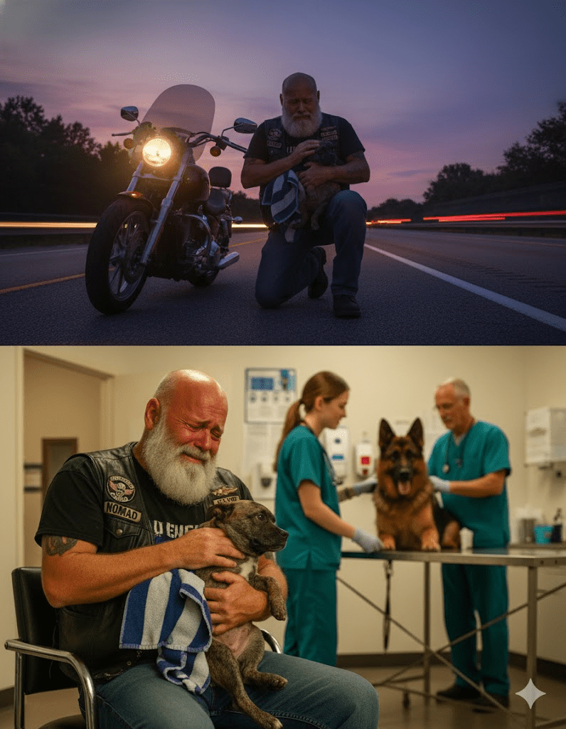 It was just another evening drive home when fate intervened. Nomad, cruising down the highway, spotted a harrowing scene on the shoulder: a tiny German Shepherd puppy, bleeding and barely clinging to life, the victim of a hit-and-run. His tough exterior crumbled as he cradled the fragile creature. The puppy’s whimpers were a siren song to his hidden compassion, a sound that cut through the roar of his bike and straight to his heart. The nearest vet was a critical twenty minutes away, and time was a luxury the puppy, whom he would later name Angel, simply didn’t have.