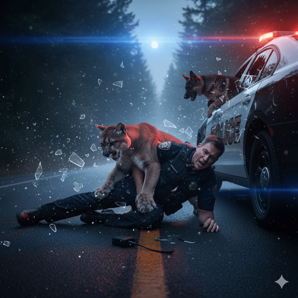 Locked securely in the back of the patrol car, Rex, Carter’s loyal K9 partner and best friend, was a captive audience to the horror unfolding just yards away. The instinct to protect his handler was overwhelming, overriding any thought of self-preservation. With a powerful surge, Rex threw himself against the reinforced window, the glass spiderwebbing under the impact of his body. A second, more forceful blow shattered the window entirely, sending shards of glass scattering across the damp pavement. Without hesitation, Rex leaped through the jagged opening, landing with a determined growl and charging directly towards the embattled officer and the menacing cougar.