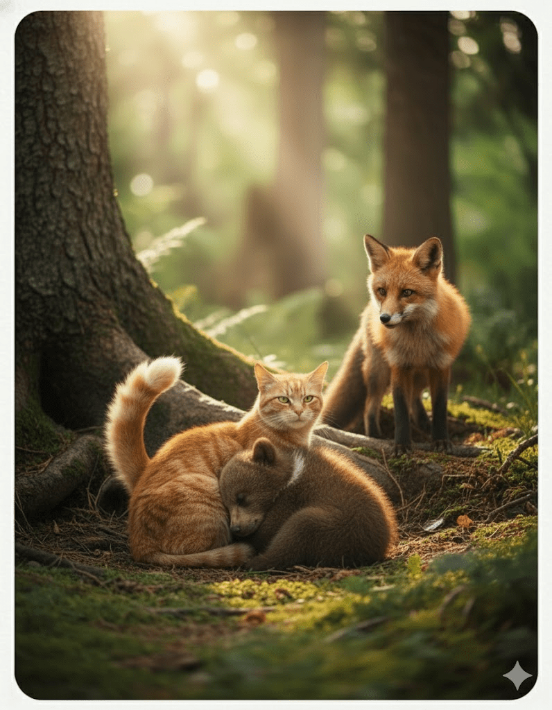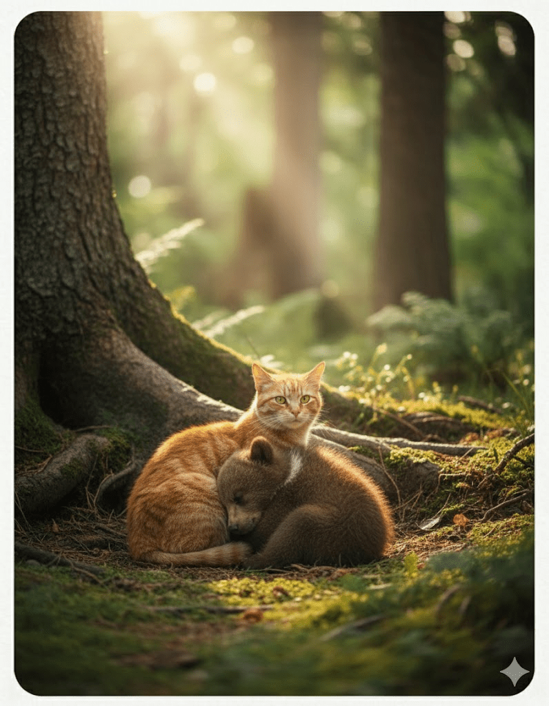 In the quiet, unassuming depths of a vast nature reserve, an extraordinary bond began to blossom, defying the very laws of the wild and captivating the hearts of all who witnessed it. It started subtly, a mere whisper among the park rangers about a stray ginger cat, known for her fiercely independent spirit, who had adopted an orphaned bear cub. Initially, the reports were dismissed as fanciful tales, products of overworked imaginations. After all, such an alliance was unheard of – a predator and prey, their roles reversed, united by an unspoken maternal instinct. Yet, as days turned into weeks, the sightings became more frequent, more detailed, and utterly undeniable. The cat, affectionately named “Rusty” by the rangers, was seen grooming the tiny, bewildered cub, shielding it from perceived threats, and even attempting to teach it the art of stealthy hunting, a skill far removed from the cub’s natural foraging instincts. This unprecedented relationship sparked a fervent curiosity, drawing researchers, naturalists, and even skeptical wildlife photographers to the reserve, all hoping to catch a glimpse of this improbable family. What truly led to this remarkable pairing remains a mystery, but the prevailing theory suggests that the cub, separated from its mother during a particularly harsh storm, stumbled upon Rusty’s makeshift den, and in a moment of pure, unadulterated compassion, the feline heart opened to a creature it was genetically programmed to avoid.