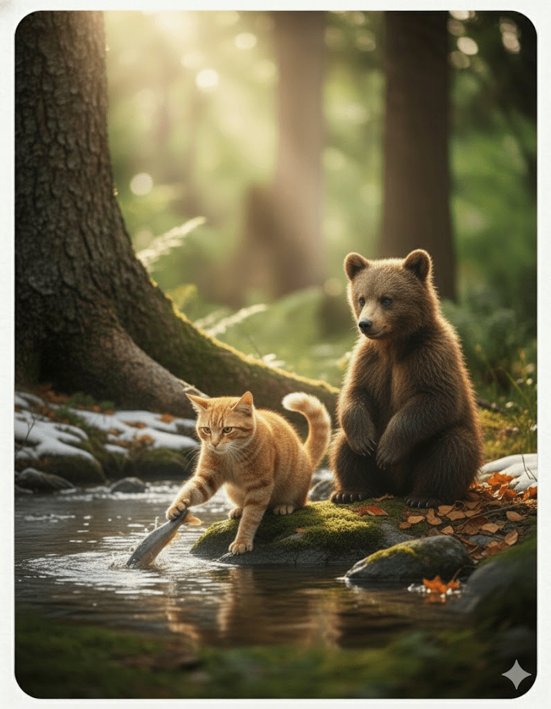 A more significant challenge emerged with the changing seasons. As winter approached, the cub, growing rapidly, began to display more of its natural ursine behaviors. Rusty, with her keen feline senses, started leading the cub to berry bushes and fishing spots along the river, adapting her hunting strategies to suit the bear’s nutritional needs.