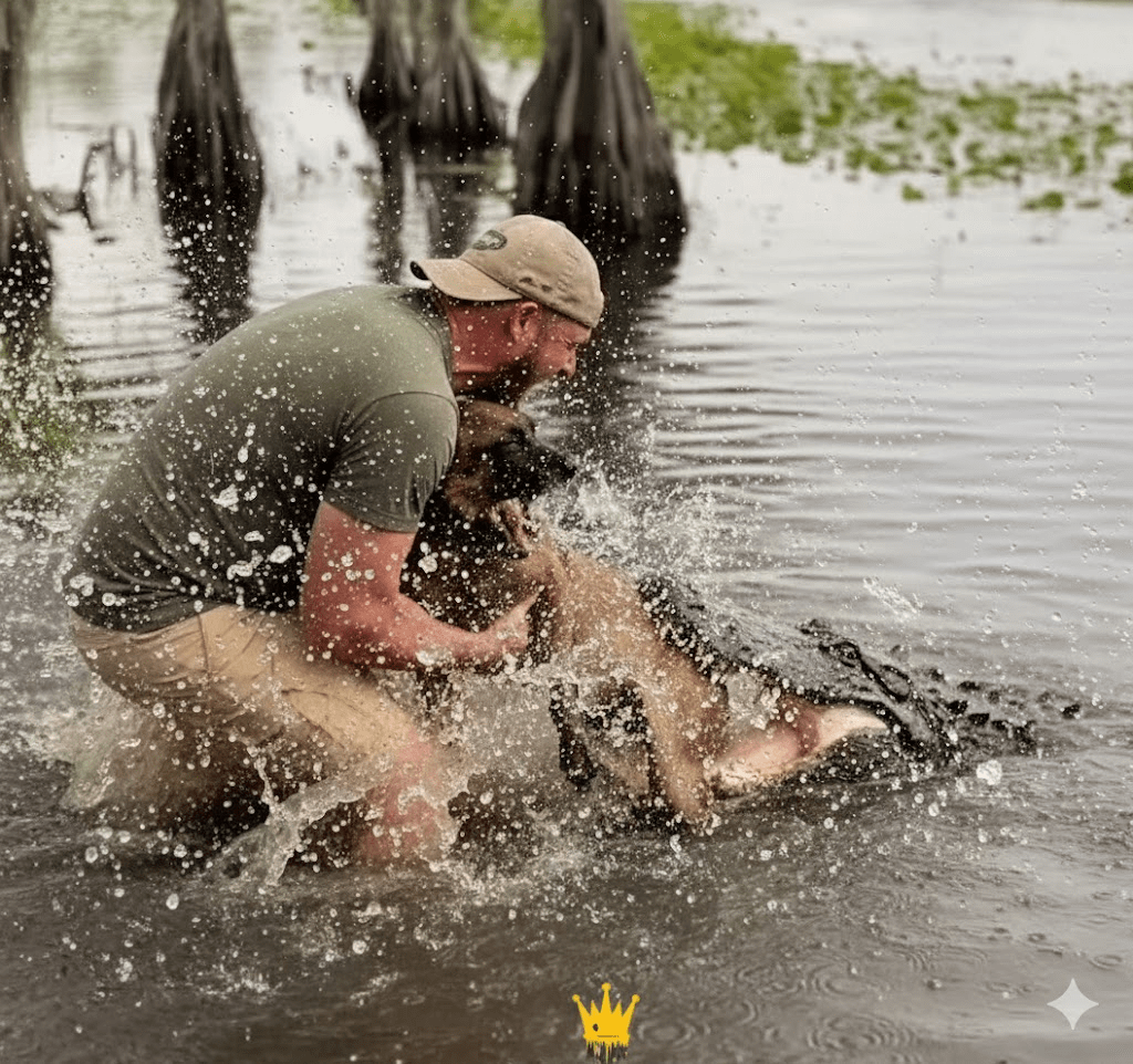 Screaming Diesel’s name, Mike plunged into the murky water, his arms flailing, desperately trying to create a disturbance, anything to distract the gator. He knew the immense risk, but the thought of losing Diesel was unbearable. He managed to grab hold of his dog, pulling with all his might, but the gator’s grip was unyielding. The struggle was fierce, a primal battle unfolding in the heart of the swamp, with the outcome hanging precariously in the balance.