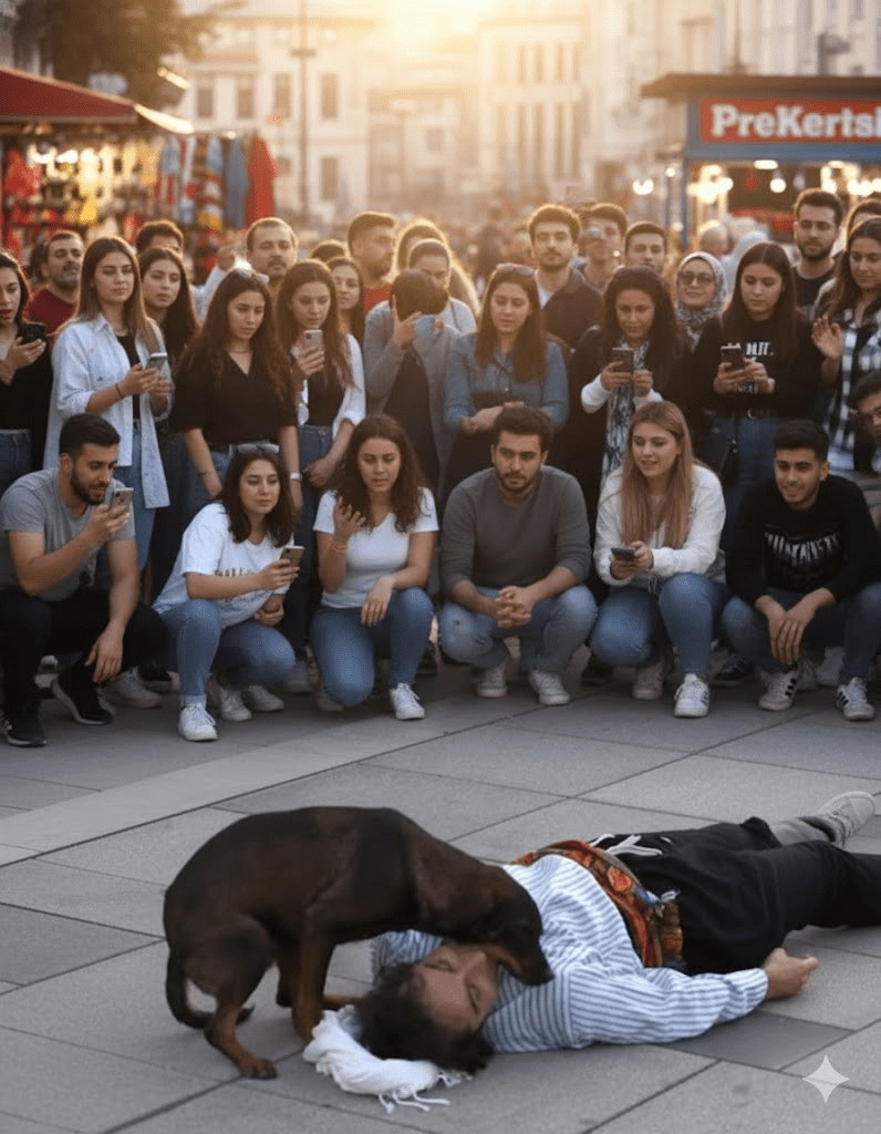 As Mehmet lay “unconscious,” the initial reaction from the audience was one of rapt attention, fully immersed in the drama. His fellow actors continued their scene, their lines delivered with practiced urgency, creating a tense atmosphere. Then, a shadow detached itself from the periphery of the bustling square. A medium-sized, scruffy brown dog, a common sight in the meandering streets of Istanbul, hesitantly approached the edge of the crowd. Its eyes, usually alert and wary, seemed fixed on Mehmet’s prostrate form. There was a palpable shift in its demeanor; the usual detached indifference of a stray replaced by an intense, almost human concern. The crowd, initially unnoticing, began to whisper as the dog moved closer, its steps cautious but determined.