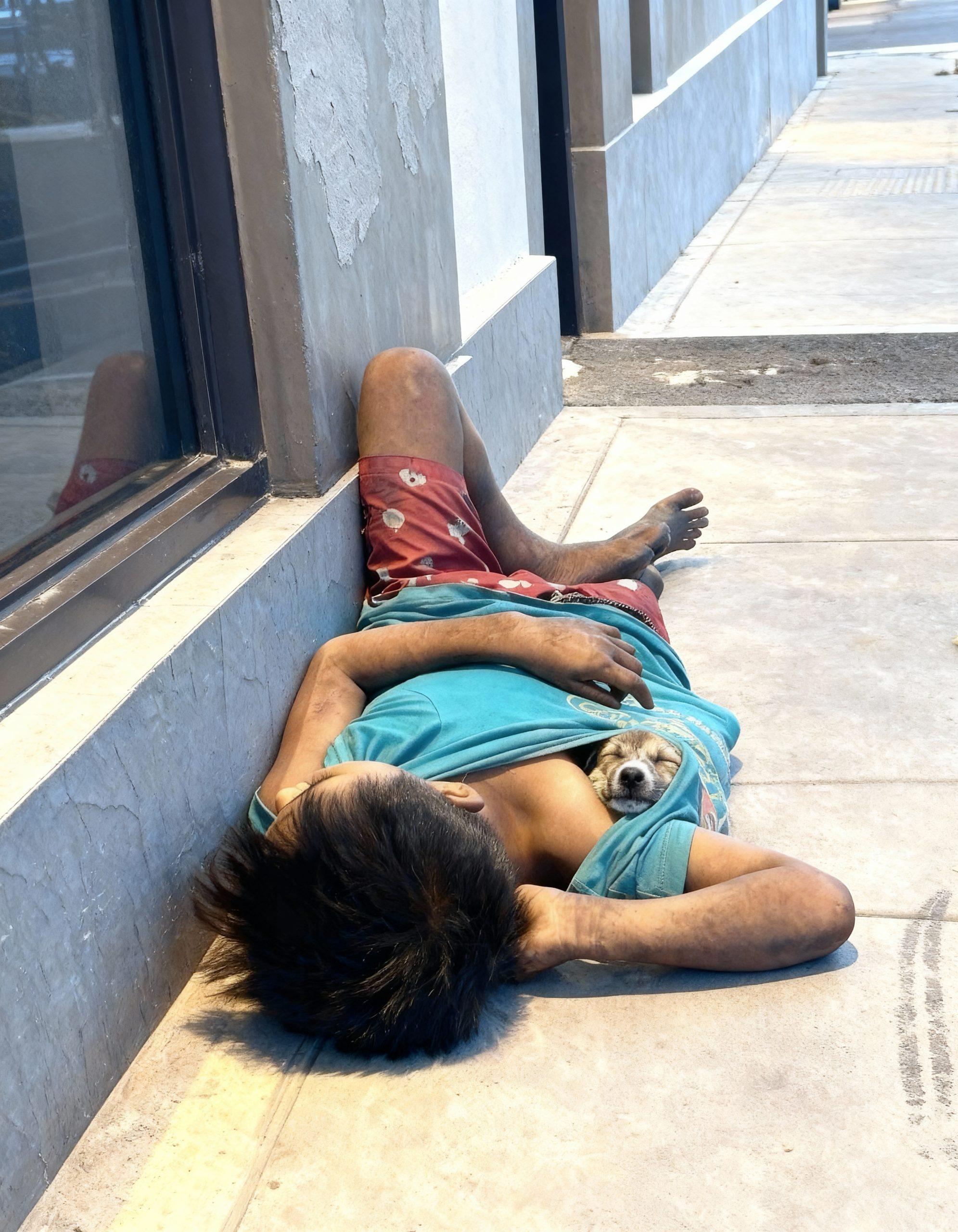 In the heart of a bustling metropolitan street, where the relentless rhythm of urban life pulses without pause—pedestrians hurrying past with coffee cups in hand, vehicles honking in distant traffic, and the occasional flicker of neon signs reflecting off polished glass storefronts—a poignant scene unfolded one crisp afternoon that would capture the imagination of thousands and remind the world of humanity’s quiet resilience. Amid the concrete jungle of cracked sidewalks and indifferent architecture, a man with weathered skin and tattered red shorts lay curled against a nondescript building wall, his only possessions seemingly the clothes on his back and a faded blue shirt that barely covered his frame. What began as an ordinary snapshot of hardship, captured inadvertently by a passerby’s camera, spiraled into an extraordinary tale of loyalty, sacrifice, and unexpected twists that revealed layers of depth beneath the surface of despair, challenging onlookers to reconsider the true meaning of home and heroism in a society quick to avert its gaze from the marginalized.