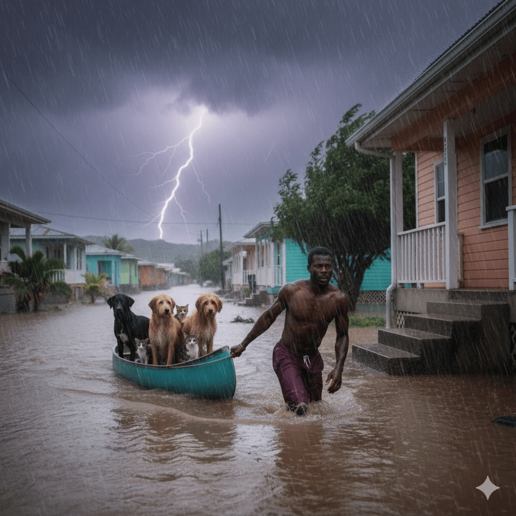 In the chaotic wake of Hurricane Melissa, which unleashed its destructive power upon the island nation of Jamaica, stories of resilience and sacrifice emerged. Amidst the rising floodwaters and the relentless wind, one particular tale captivated hearts and defied expectations – the unwavering loyalty of a homeless man towards his beloved stray dogs and cats. While evacuation orders echoed through the affected communities, many residents sought refuge in safer zones. Yet, this man, known only to some as “The Guardian,” made a conscious and perilous choice: to remain behind, an anchor for the vulnerable creatures who, like him, had no roof over their heads. His profound declaration to overwhelmed rescuers — “Those dogs are my only friends on the street. I’m not gonna leave them” — resonated deeply, laying bare a bond that transcended the common understanding of companionship. This decision, seemingly reckless to some, was for him the only conceivable path, setting the stage for a dramatic struggle for survival against nature’s wrath.