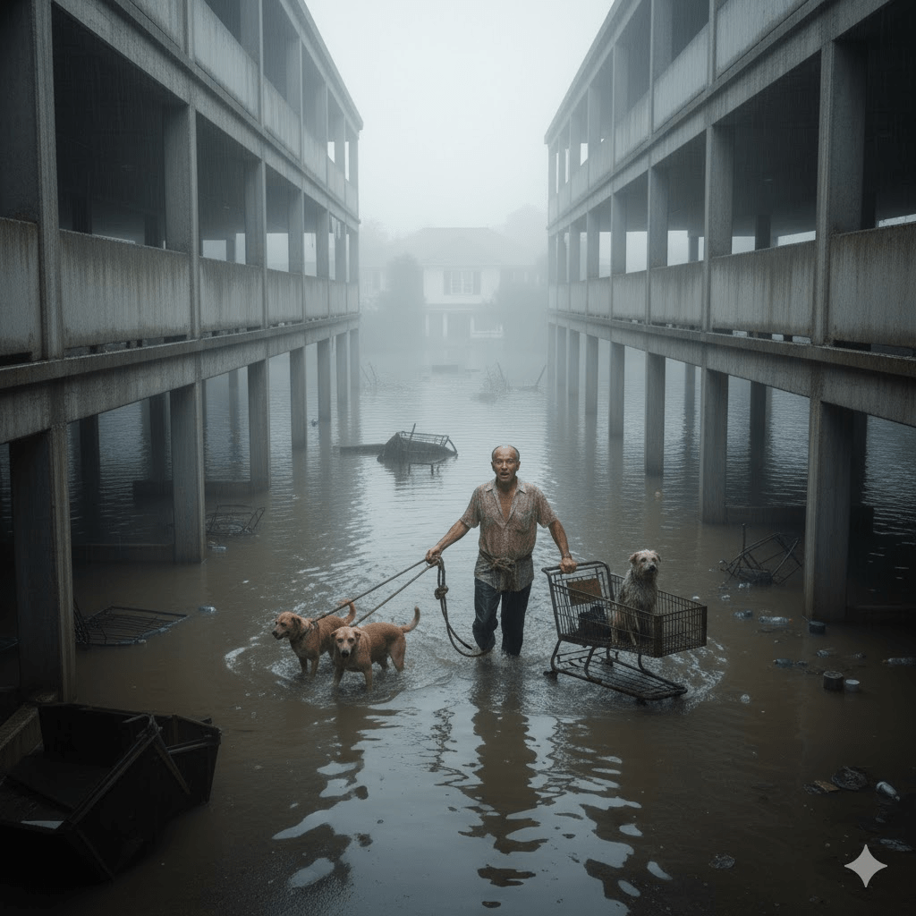 The choice before Michael was stark: seek his own safety or answer the silent plea of creatures in distress. For a man who owned little more than the clothes on his back, the decision was instantaneous. He grabbed a handful of old ropes and the rickety shopping carts that had once carried his meager belongings. With a resolve born of empathy, he plunged into the waist-high, churning water. The current was strong, the debris treacherous, but the desperate barks spurred him onward. One by one, he pulled terrified dogs from precarious perches, guiding them through the murky depths to the higher ground of his temporary garage home.