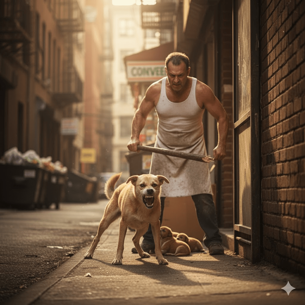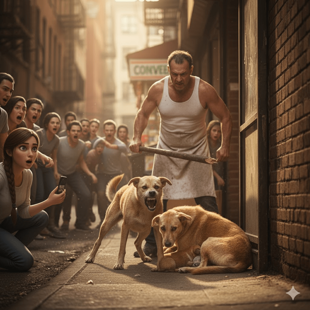 The store owner, momentarily startled by Luna’s ferocity, hesitated but did not retreat. He swung the stick, aiming a blow that Luna instinctively intercepted. A yelp of pain escaped her as the stick connected, leaving a visible gash on her back. Yet, she did not falter. Instead, her defiance intensified, fueled by the desperate need to shield her pups. Each subsequent blow she endured was a testament to her unyielding commitment. Passersby, drawn by the commotion, began to gather, their murmurs growing louder, their faces reflecting a mix of shock and outrage. Among them was a young woman named Anya, a local artist known for her quiet compassion, who had been sketching nearby. She pulled out her phone, her hands shaking, and began to record the unfolding tragedy.