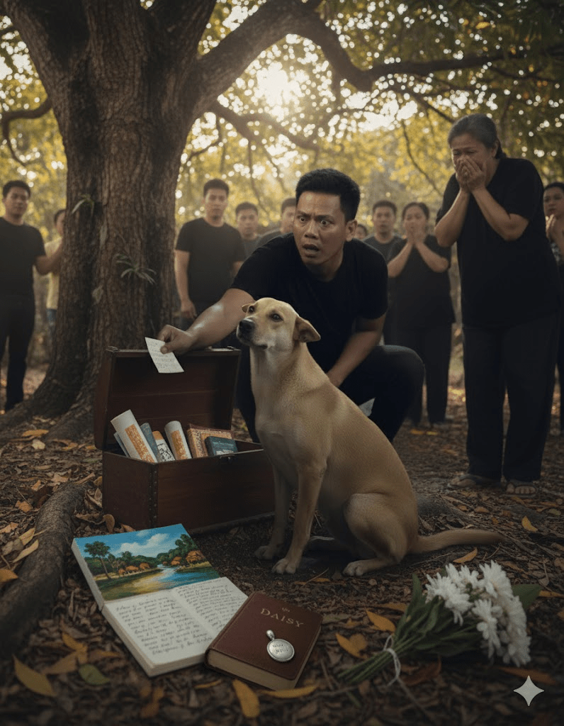 A small expedition, including Marco, Daisy, and a few other family members, embarked on the journey. After a long drive and a trek through dense woods, they arrived at the spot marked on the map. There, beneath an ancient banyan tree, they found a weathered wooden chest. Inside were stacks of Maria’s unpublished artworks, heartfelt letters, and a small, engraved locket with Daisy’s name on it. It was a posthumous gift, a final act of love and a revelation of Maria’s secret life as a prolific artist, known only to her faithful canine companion.