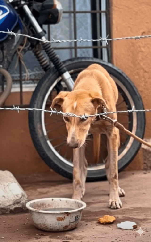 In the quiet, dusty corners of a forgotten town, where time seemed to move at a different pace, a haunting silence was abruptly shattered one sweltering afternoon. It wasn’t the usual cacophony of barking dogs or the distant rumble of traffic, but a raw, desperate howl that pierced the air, carrying with it a tale of unimaginable struggle. Behind a rusted barbed-wire fence, a skeletal dog, a mere shadow of what a living creature should be, strained against its tattered leash. Its ribs protruded like a macabre xylophone, its fur matted with grime, and its eyes, though clouded with pain, held a spark of defiance. This was not just a dog; it was a symbol, a living testament to an enduring spirit trapped in a nightmare. Its emaciated body, framed by the cold, unforgiving metal of a parked motorcycle, seemed to vibrate with a silent plea, a desperate cry for salvation in a world that had seemingly abandoned it. The scene was stark, a visceral punch to the gut, hinting at a story far more profound and heartbreaking than any casual observer could imagine.