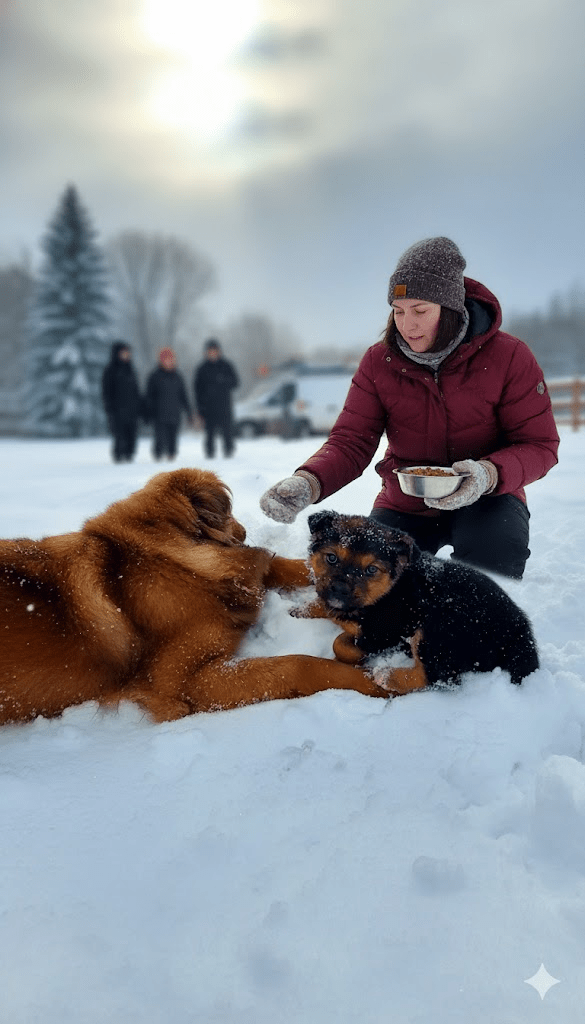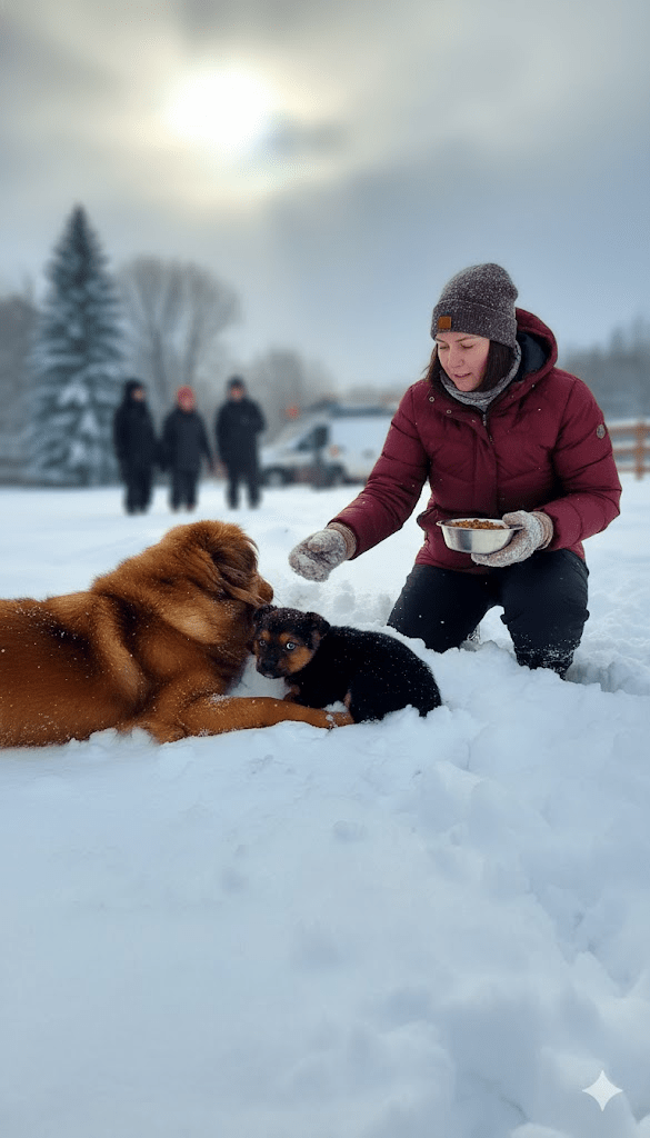 The biting cold of early winter had just begun to settle over the quiet, snow-laden fields when a startling discovery was made. Amidst the pristine white expanse, a tiny, dark-furred puppy, barely more than a few weeks old, lay nestled against what appeared to be the protective warmth of a larger, reddish-brown dog. Snowflakes clung to its soft fur, and its wide, expressive eyes, a striking contrast to its dark face, held a mixture of innocence and a hint of trepidation. This poignant scene, captured by a local farmer on his morning rounds, quickly became more than just a photograph; it was the opening chapter of a gripping tale of survival, instinct, and unexpected bonds that would soon captivate the entire community. The image sparked an immediate outpouring of concern, and what began as a simple observation rapidly escalated into a full-scale rescue operation, revealing layers of a story far more complex and heartwarming than anyone could have initially imagined.