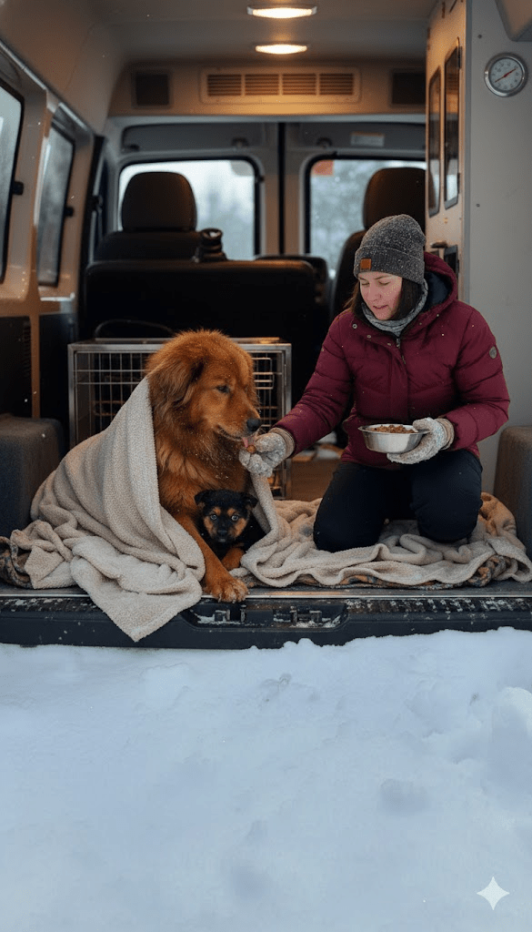 Ultimately, a plan was devised to gently net Goldie and Shadow together, ensuring minimal stress and maintaining their crucial connection. The day of the rescue was tense, but with careful coordination and Goldie’s newfound, albeit fragile, trust in Sarah, they managed to bring both dogs safely into the rescue vehicle. Shadow, nestled securely against Goldie’s fur, whimpered softly but remained calm, his little body trembling slightly as the warmth of the heater began to thaw his tiny paws. The journey to the shelter was quiet, filled with a sense of relief and hope for their future.