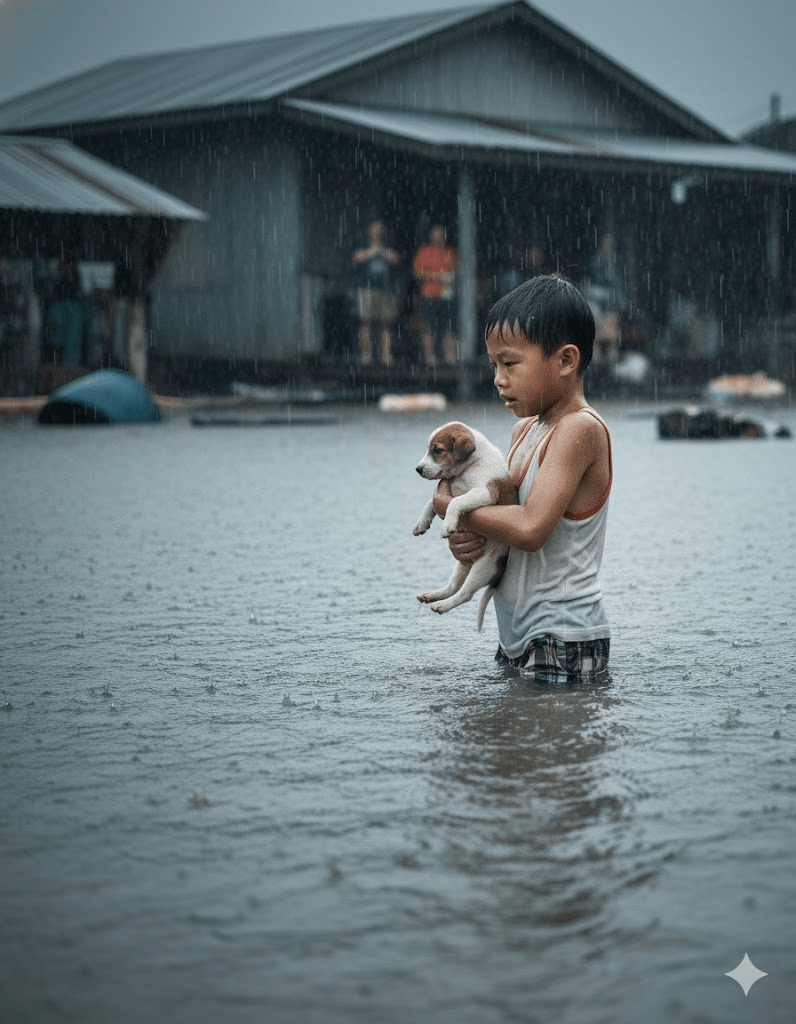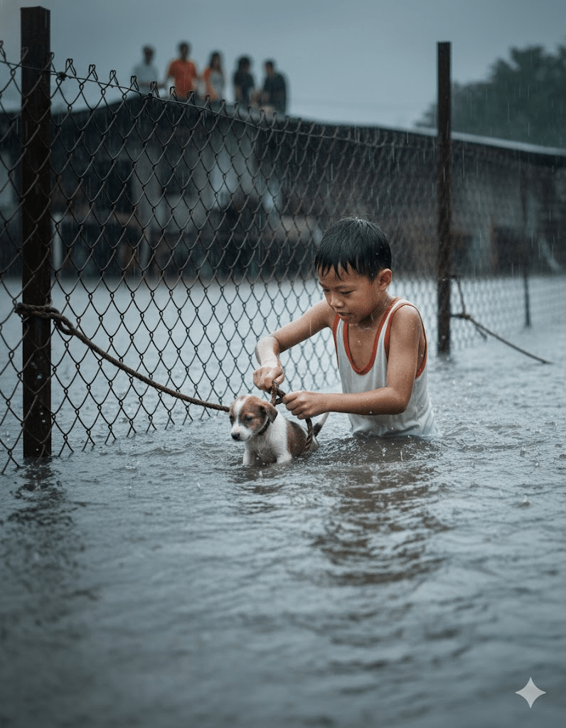 The relentless downpour had transformed the familiar streets of the village into treacherous rivers, houses half-submerged, and the cries of the storm echoing a chilling warning. Amidst the chaos and the scramble for safety, a solitary figure emerged, a beacon of selfless courage. Seven-year-old Ethan, his small frame defying the surging currents, embarked on a perilous mission. His keen eyes had caught a glimpse of a tiny, defenseless puppy, tethered precariously to a submerged fence post, its desperate whimpers almost lost in the storm’s fury. The sight ignited an unyielding determination in Ethan’s heart, overriding any fear for his own safety. He knew, with an innocent yet profound conviction, that he could not abandon the creature to its watery fate.